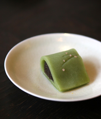 はつはぎ。夏の終わり、涼しい山の中ではちらほらと赤紫の花が咲き始めます。中秋の名月のお供えにも欠かせない萩。写真はこなし生地製で芯は大島餡(黒糖餡。砂糖黍が奄美大島特産だから)。鮮やかな黄緑の葉色を映しました。