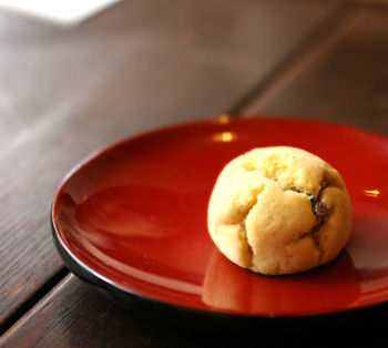 いわゆる、黄味時雨。口の中でほろほろとくずれる優しい味の蒸し饅頭。お月様のまあるい形と、柔らかい光のイメージ。生地は、上用粉・黄味餡、中にはこし餡。