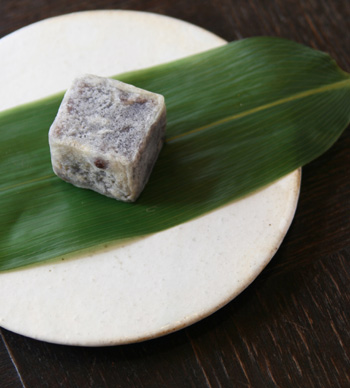 金鍔。江戸時代からある庶民のお菓子。四角く固めた粒餡に、薄い小麦粉の焼き皮を付けたもの。