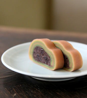 新緑と桜の春の山を、こなし生地で表現。微妙な曲線と、なめらかで艶のある質感が魅惑的。真ん中は丹波大納言小豆のつぶ餡。